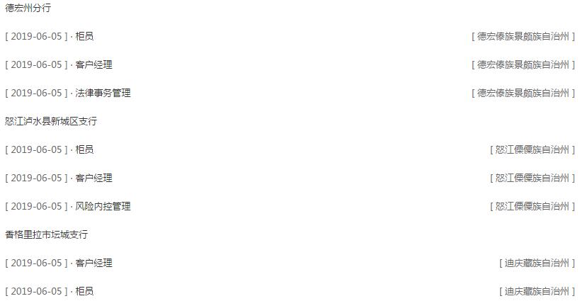 其中,怒江瀘水縣新城區(qū)支行、迪慶香格里拉縣壇城支行招聘學(xué)歷條件為具有國(guó)家統(tǒng)招的全日制普通高等院校大學(xué)專(zhuān)科(含)以上學(xué)歷。