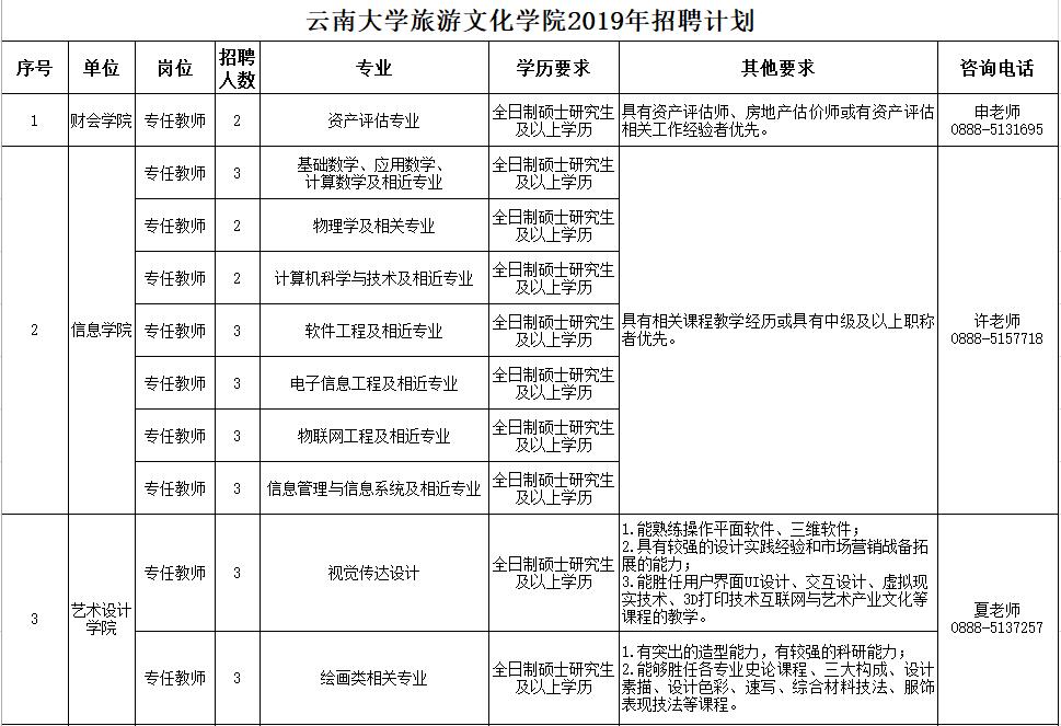 附件:云南大學旅游文化學院2019年招聘計劃 2019.3.15